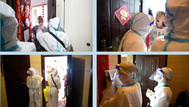 在取样现场,医护人员严格执行采样流程,为受检者进行核酸咽拭子采样,她们的工作步骤行云流水、一气呵成。